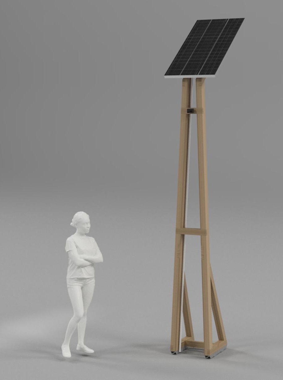 Estructura de madera diseñada para alojar un panel fotovoltaico, paneles informativos y cámaras de video en altura.