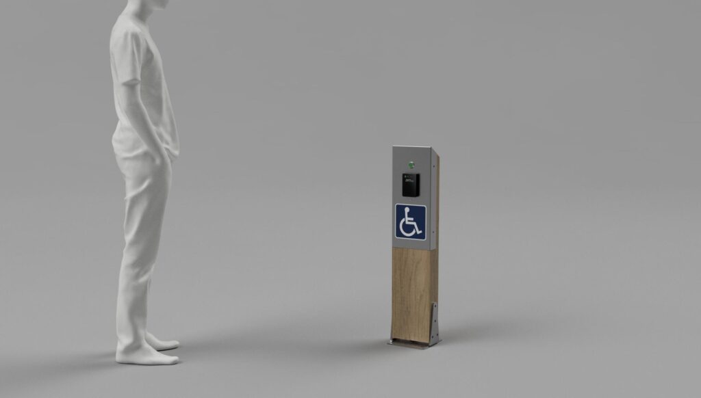 Poste de madera con cabeza metálica diseñado para alojar un radar de proximidad y un indicador LED.